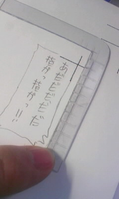 しかし…このデジタル全盛の業界情勢で、こんな小学校の工作レベルの工具を自作してんのは、今や私くらいかと思うと若干凹みます。ほっとくと意味もなく『ハチ○ンダイバー』8巻あたりの写植サイズ(※異常に文字がデカくてキャラが見切れまくる)になっちゃうのがいけないんですけど。